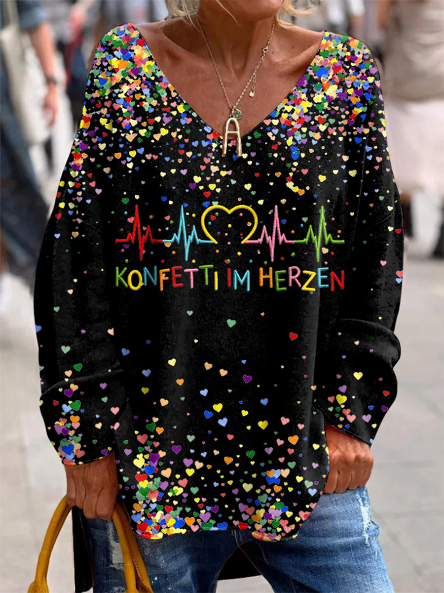 Bedrucktes V-Ausschnitt Revers knopf Vintage Lässiges Langarm-Shirt